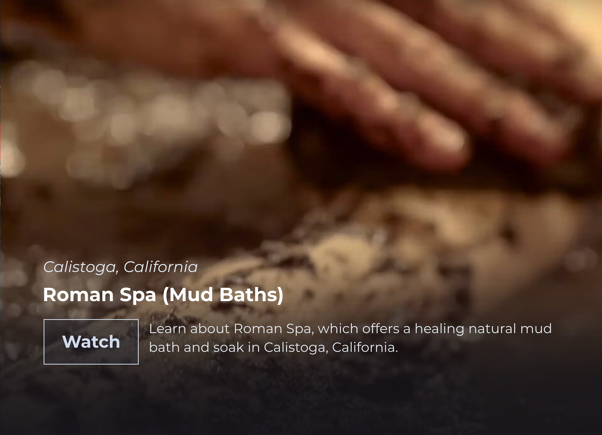 Calistoga Roman Mud Baths Learn about Roman Spa, which offers a healing natural mud bath and soak in Calistoga, California.